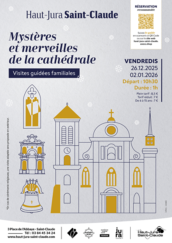 - sur place dans l'un de nos Offices de Tourisme (Lajoux, La Pesse et Saint-Claude).Réservation conseillée, nombre de places limitées. Durée : 1h Lieu de départ : 3 place de l'Abbaye 39200 Saint-Claude. Merci de vous présenter 10 min avant le début de la visite.